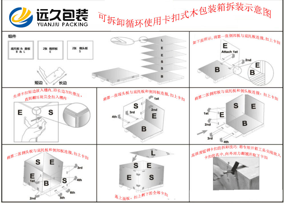 我们经常说的免熏蒸包装箱指的是在出口使用时,不需要高温杀菌消毒,可以直接出口使用的木制包装箱。得益于中国制造的精益求精,每年都有大量的机械设备产品出口到世界各地,作为物流的起点,包装完成后便具有物流的功能的包装箱对产品发挥了保护作用,因此出口包装箱的使用量在我国包装行业中占有很大的比例。 随着环保意识的不断加强,包装工业也备受人们的关注,越来越多的人开始关注和逐渐改变使用一次性包装的行为。21世纪人类社会的发展方向,不再是建立在更多地消耗资源上,而是更加节约、回收和再利用资源的基础上。在这个背景下,可循环使用的包装箱脱颖而出,与一次性包装相比,可循环使用的包装箱拥有很多优点。 在科技发展日新月异的现代工业社会,技术上的革新往往可以带动多领域的发展,在包装箱行业更是非常的明显。比如今天给大家介绍的新型卡扣包装箱,可以算是一款利用新技术制作的可循环使用,可快速拆装的符合环保要求的包装箱。 卡扣包装箱,英文名称:Wooden buckle ,产品别名:无钉包装箱;使用高强度金属制件将胶合板或刨花板连接而成,适用于各类产品的运输,无论其规模大小,是否易碎,轻重与否。除了传统木质包装箱的特性外,还具有免工具便捷拆装,重复使用,可折叠,可堆叠,成本低等诸多特性,一经面市就广受企业青昧。 ◆可循环使用的包装箱的制作原料自然环保,能够有效地减少环境污染。 ◆根据客户要求尺寸可量身定做,亦可由我方设计人员提供相应包装解决方案; ◆可以重复使用,节约了资源的消耗,减少了废弃物的量,降低了社会成本。 ◆产品轻便、坚固、占用空间少、折迭率高,极为有效的节省了运输和存储空间; ◆和一次性包装相比,可循环使用的包装箱的牢固程度更高,保护物品更加安全可靠。 ◆灵活的装卸方式可使包装工作能够轻松完成,也可以多次装卸; ◆成本比其他方式的包装箱要节省很多; ◆符合国家出口包装检疫标准,可直接出口、无需熏蒸热处理; ◆卡扣包装箱和六片式钢边包装箱一样采用无钉化作业,完全杜绝了在包装过程中因组装工具及人力的不当操作而使得产品出现破损情况,并显著地降低了工人在装卸过程中发生工伤的风险。